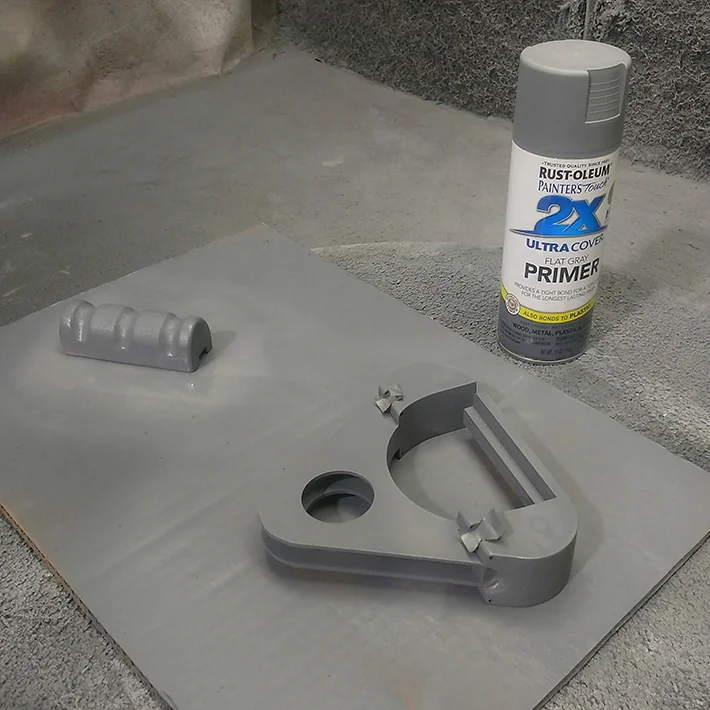 Laser cut acrylic and 3D printed hinges were laminated to create the form of the display model, which was then surfaced with sandblasting, body filler, and sanding. The model was then primed and painted. A carved foam handle and LEDs were added for visual accuracy.